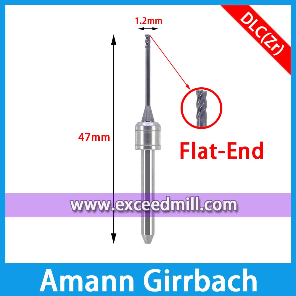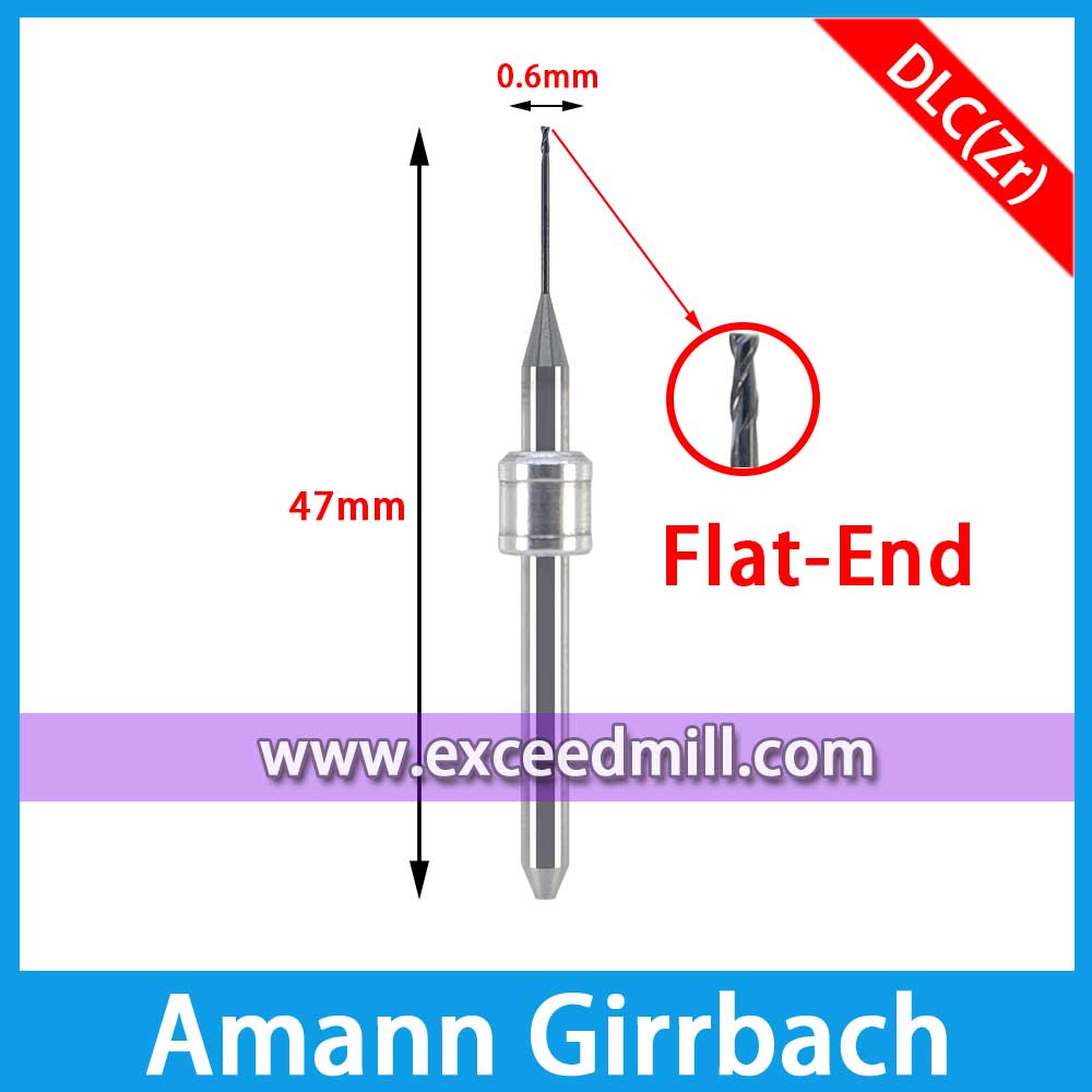 - DLC Coat with flat-end special for milling zirconia implant. 0.6mm has 2 blades and 1.2mm has 4 blades.
